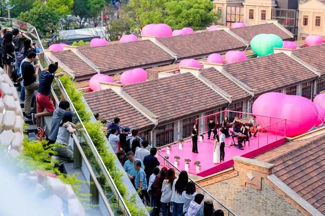在滨港商业中心观景步道“甜爱廊”拾级而上,今潮8弄完整保留修缮的8条弄堂与66幢老建筑尽收眼底。连续五个周末,十余场不同主题的弄堂屋顶音乐会在粉色爱心海接连上演,观众抬手即可定格“百年穿越、古今同框”的氛围大片。